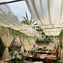 Our pergolas have a standard width of 10'. These are non-adjustable as they are created with wooden poles & beams. Our cabanas have an adjustable width from 10' to 15'. Length can vary based on what your area allows. Cabanas are created with standard pipe & drape equipment.